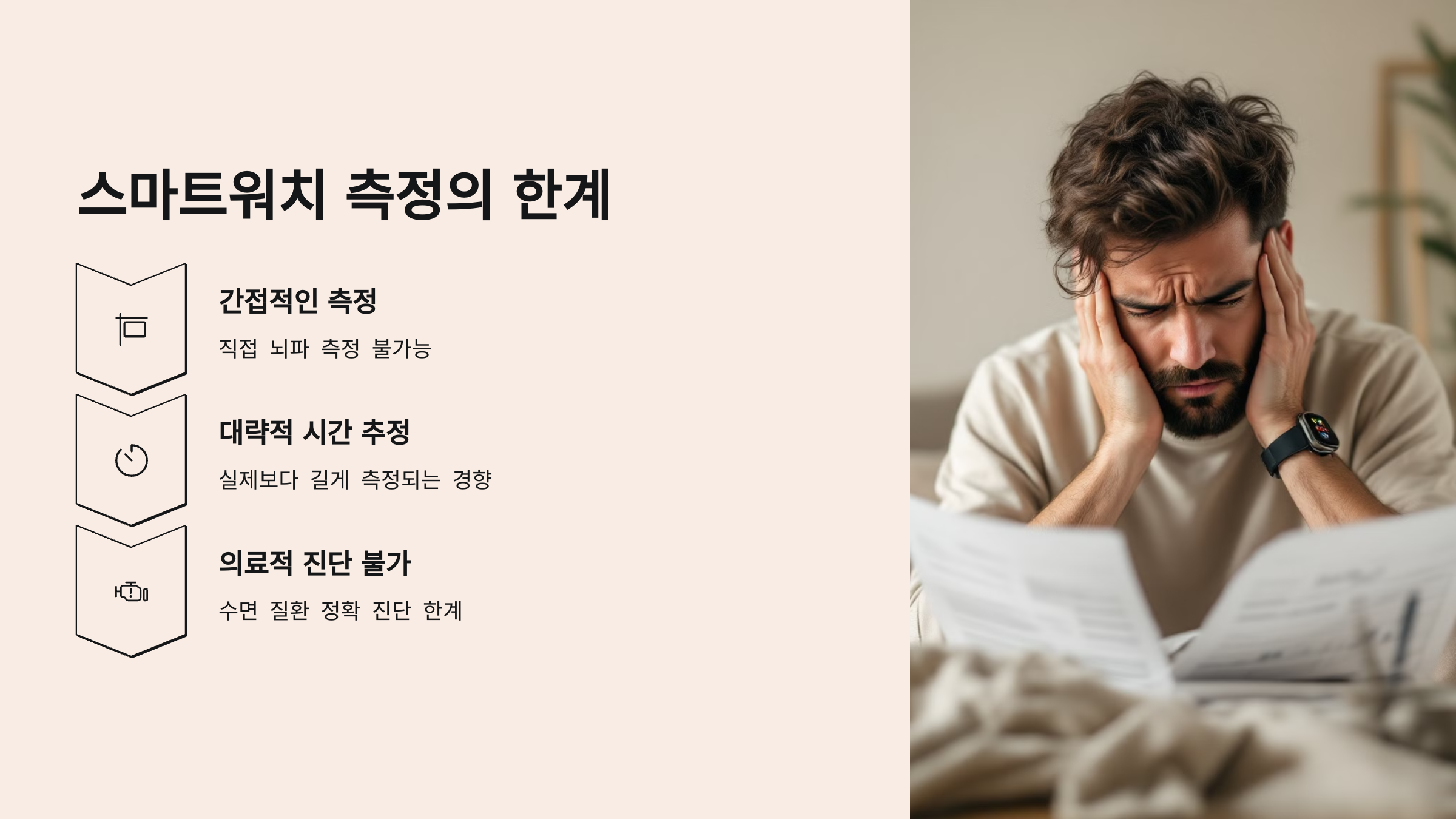 ✔ 뇌파 측정 불가능 ➜ 수면 단계 정확도 한계