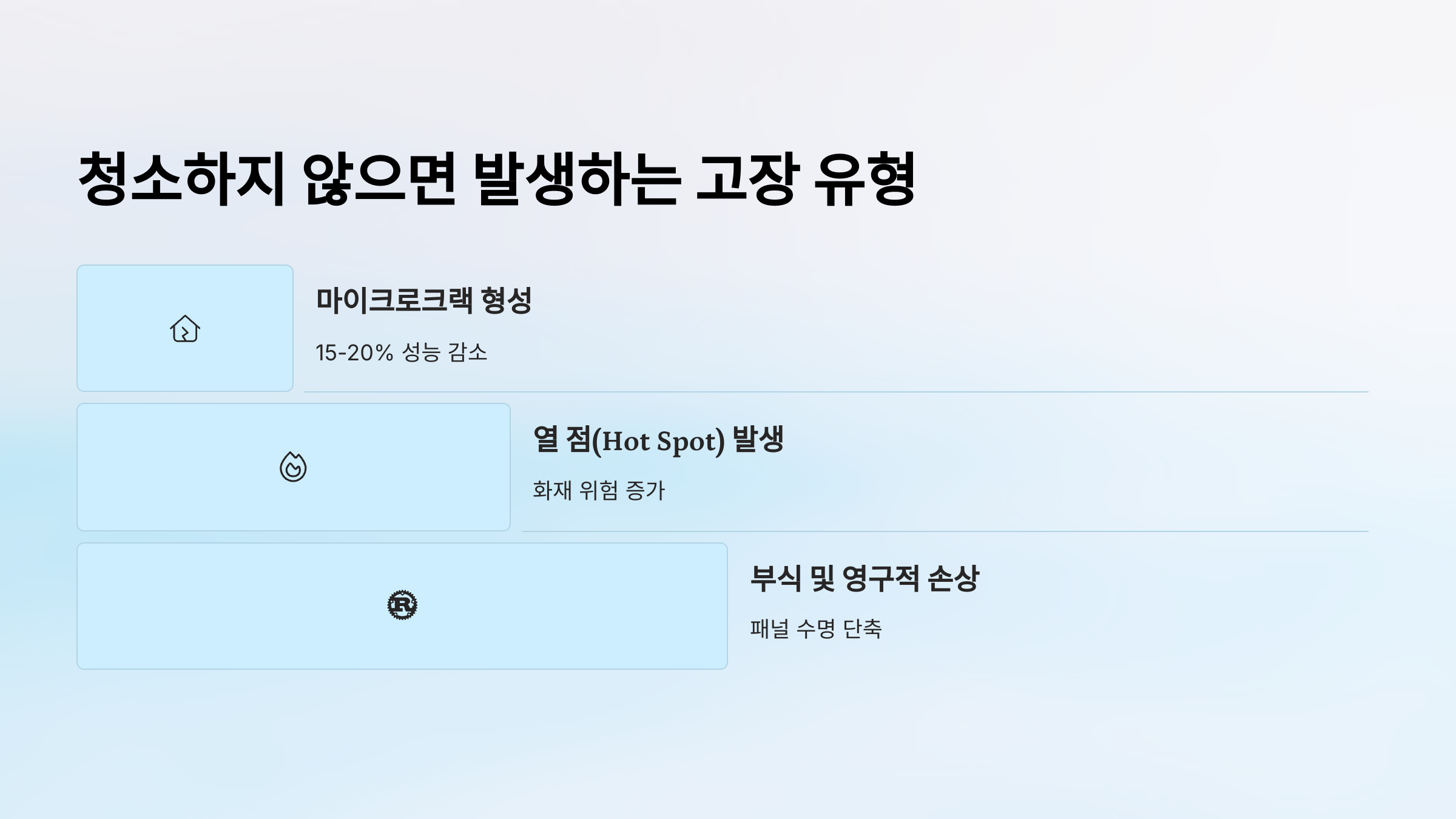 | 출력 저하 | 광선 차단, 음영 발생 | 발전량 10~30% 감소 |