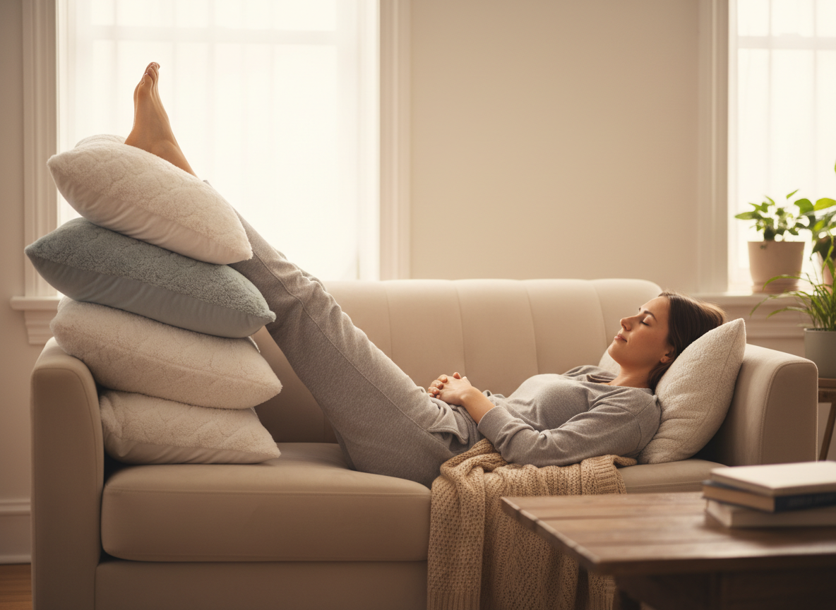 💡 꿀팁: 발목을 높게 올리고 휴식하기! 잠자기 전 베개 등을 이용해 다리를 심장보다 높게 올리면 부종 완화에 효과적입니다.