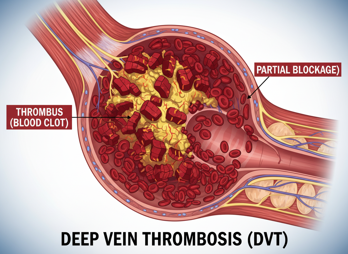 이건 정말 위험한 상황인데요, 다리 깊숙한 곳에 있는 정맥에 혈전(피떡)이 생겨 혈액의 흐름을 막는 질환이에요. 보통 한쪽 발목과 다리가 갑자기 붓고 통증, 열감, 붉어짐이 심하게 나타납니다. 혈전이 폐로 이동하면 생명을 위협할 수도 있으므로, 이런 증상이 있다면 즉시 병원을 방문해야 해요.