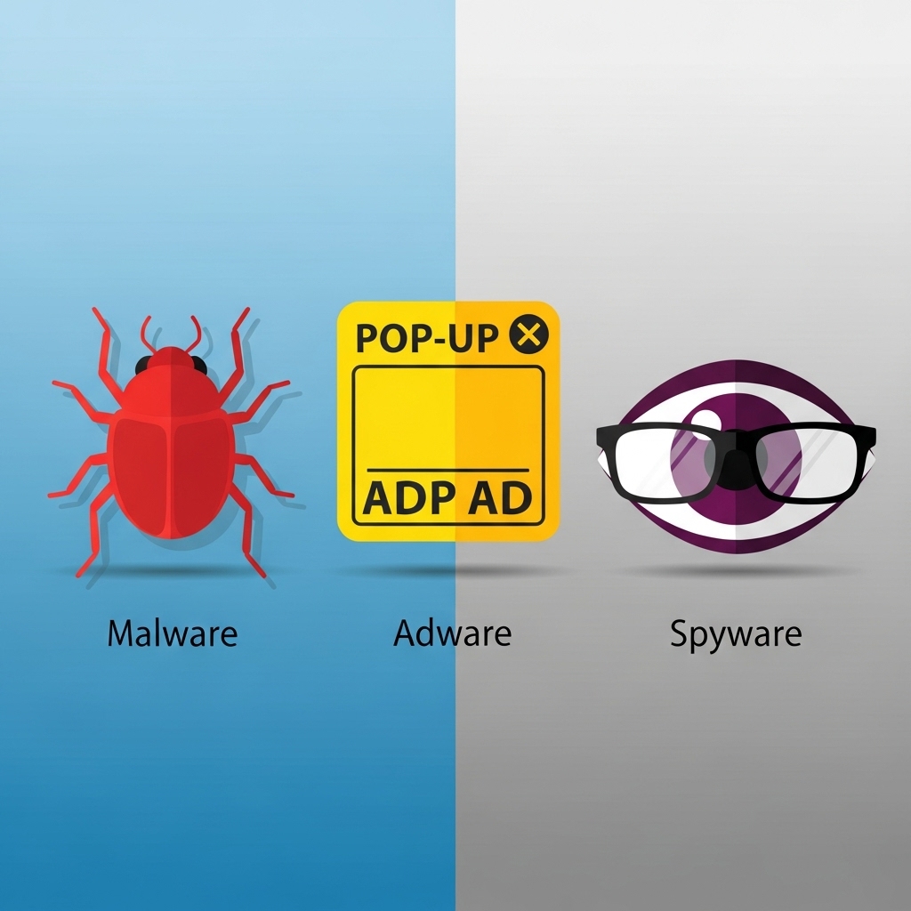 | 주요 피해/증상 | 시스템 오류, 파일 손상/암호화, 성능 저하, 정보 유출 등 심각 | 잦은 팝업 광고, 브라우저 설정 변경, 성능 저하 등 불편함/성가심 | 정보 유출 (증상 없을 수도 있음), 성능 저하 |