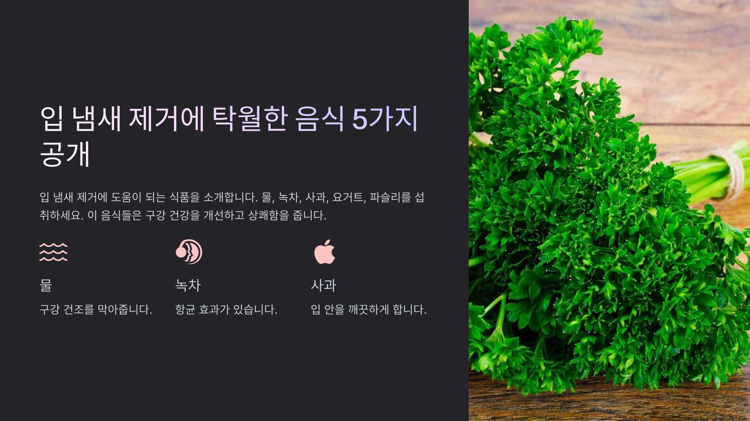 • 🧄 파슬리: 구취 유발 물질 중화