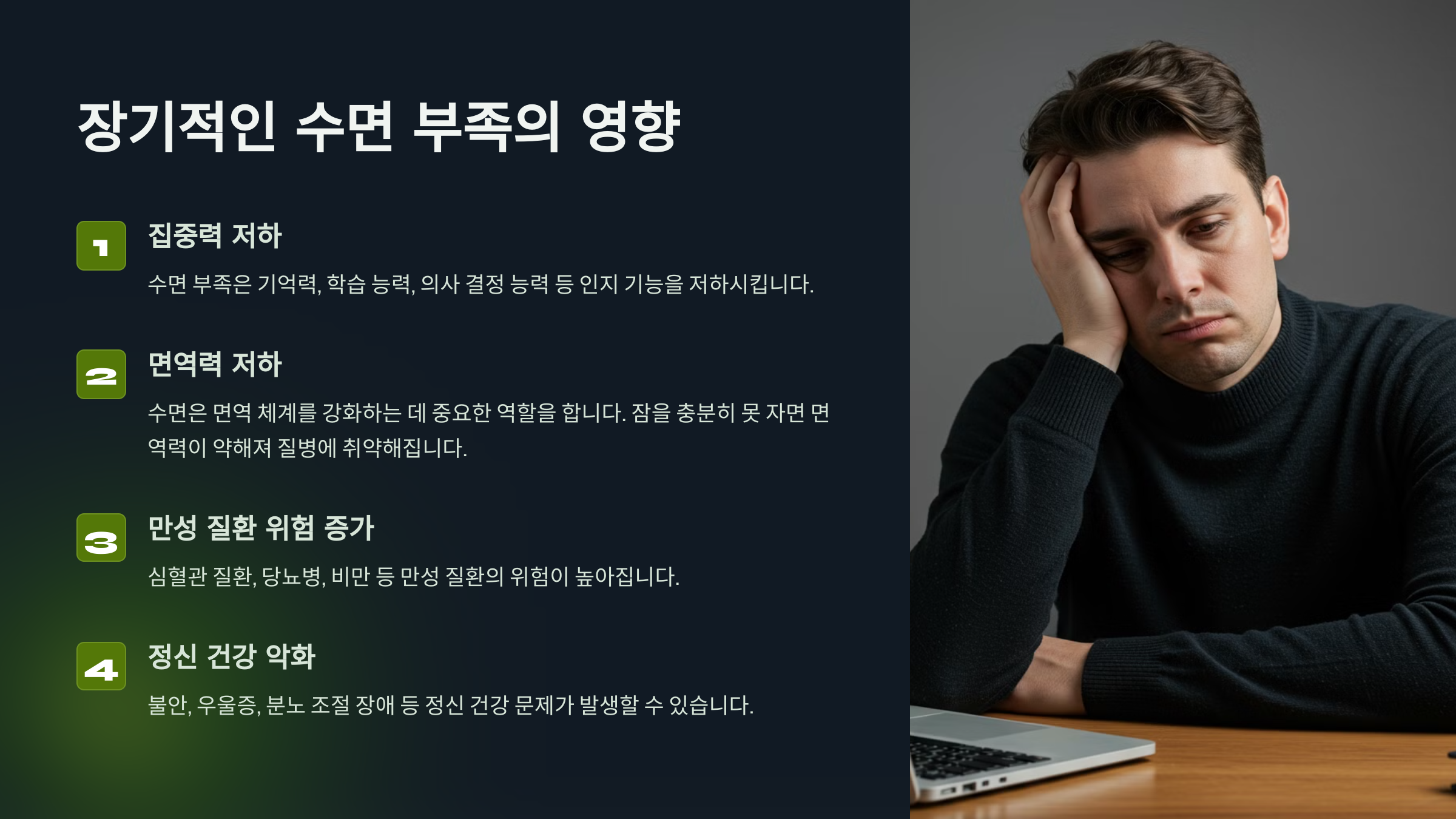 잠을 며칠 못 자면 몸이 피곤한 정도로 끝나지만, **장기간 지속되면 심각한 건강 문제**를 유발할 수 있어요. 수면 부족이 우리 몸에 미치는 영향을 알아볼까요?