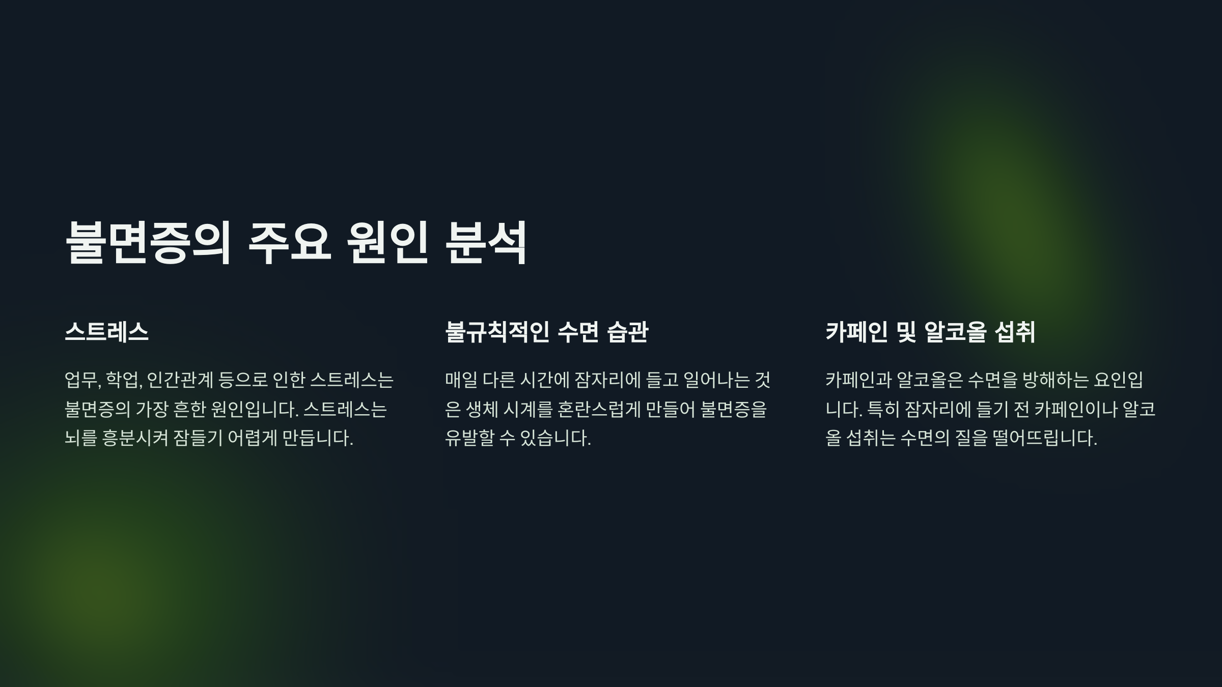 - 📌 잘못된 생활 습관: 스마트폰 사용, 카페인 섭취, 불규칙한 수면 패턴 등이 원인이 될 수 있어요.