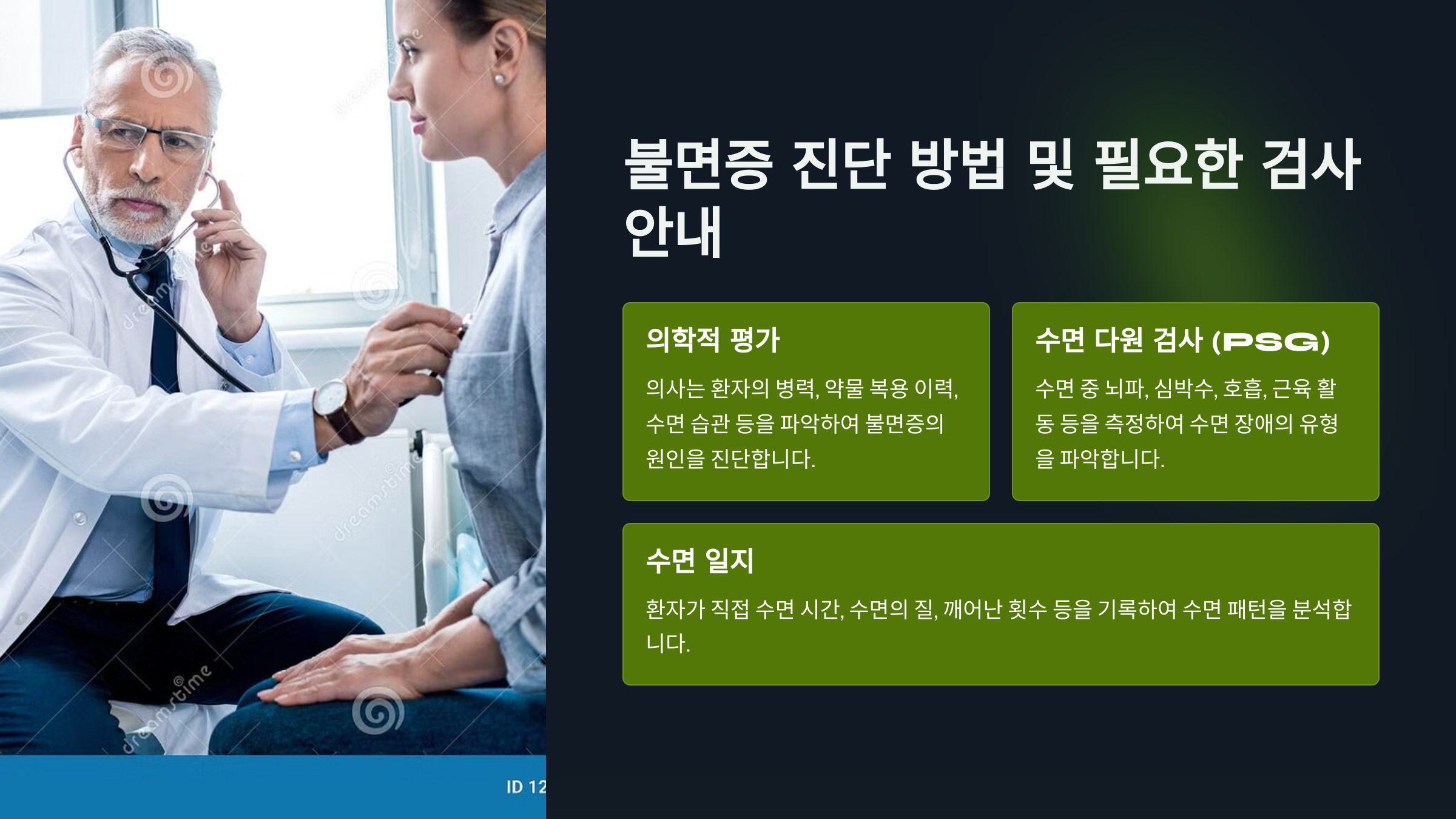 불면증이 지속된다면 병원에서 검사를 받아보는 것이 좋아요. 주요 진단 방법은 다음과 같아요.