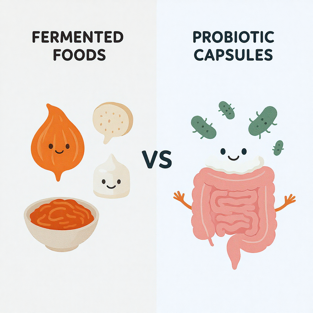 두 가지 모두 장내 환경을 건강하게 만들어주는 좋은 도구예요. 식단 속 발효식품 + 보충제 형태 유산균을 병행하는 것도 훌륭한 방법이에요.