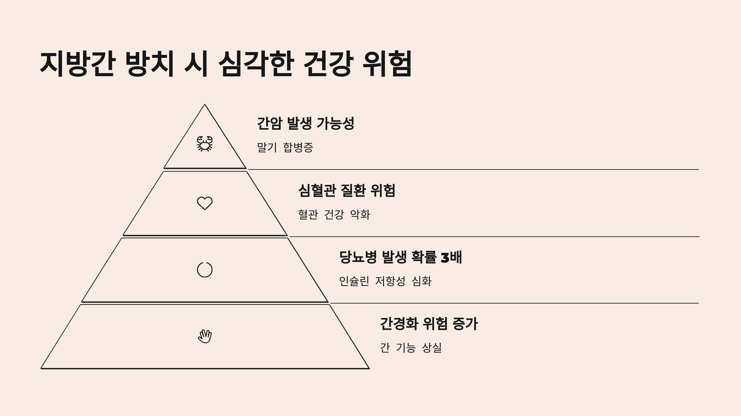 지방간 자체는 초기에는 큰 증상을 유발하지 않지만, 지속되면 간 세포에 염증이 생기고, 간섬유화 → 간경변 → 간암으로 발전할 수 있어요. 초기에 잡는 것이 무엇보다 중요해요.