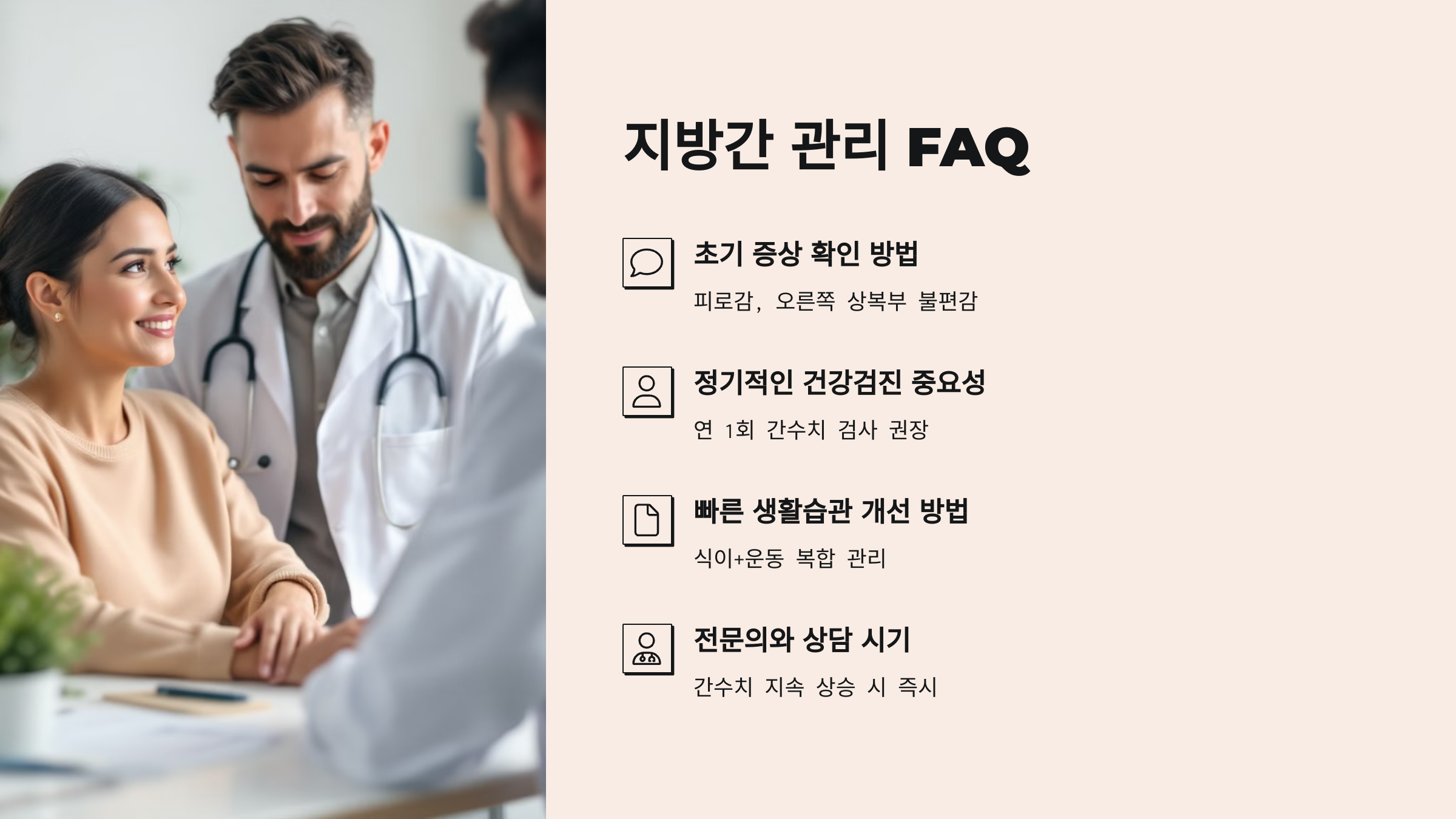 초기 지방간은 증상이 거의 없지만, 시간이 지날수록 간염·간섬유화·간경변으로 진행될 수 있어요. 실제로 간암 환자 중 많은 비율이 지방간을 방치했다가 악화된 경우예요.