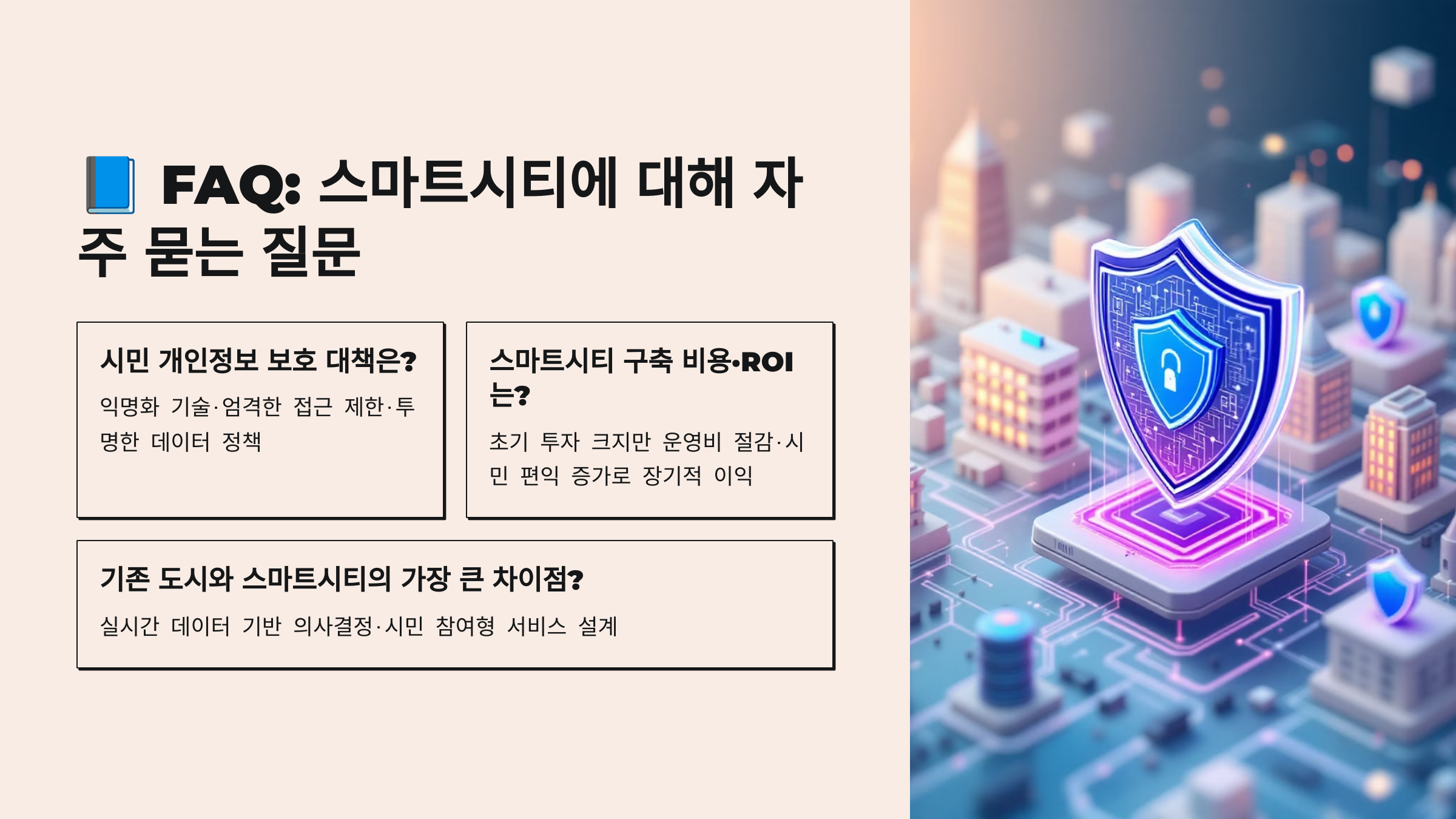 스마트시티는 시민에게 ‘불편함 없이 편리한 삶’을 제공하는 동시에, 행정비용도 줄이고 환경 부담까지 줄이는 미래형 도시 모델이에요.