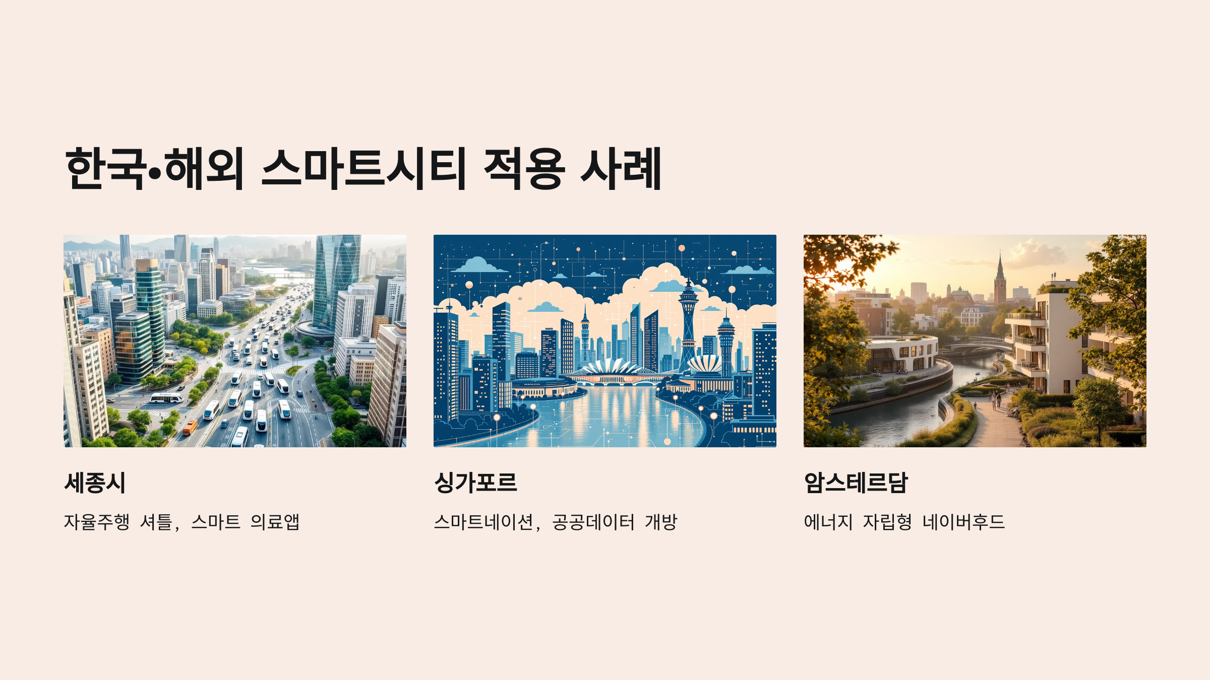 한국에서도 이미 여러 스마트시티 프로젝트가 진행되고 있어요. 대표적으로 세종시는 스마트시티 국가시범도시로 지정되어, **도로에 신호등이 없는 자율주행 중심 교통망**, **AI 기반 생활 데이터 플랫폼** 등이 도입되고 있어요.