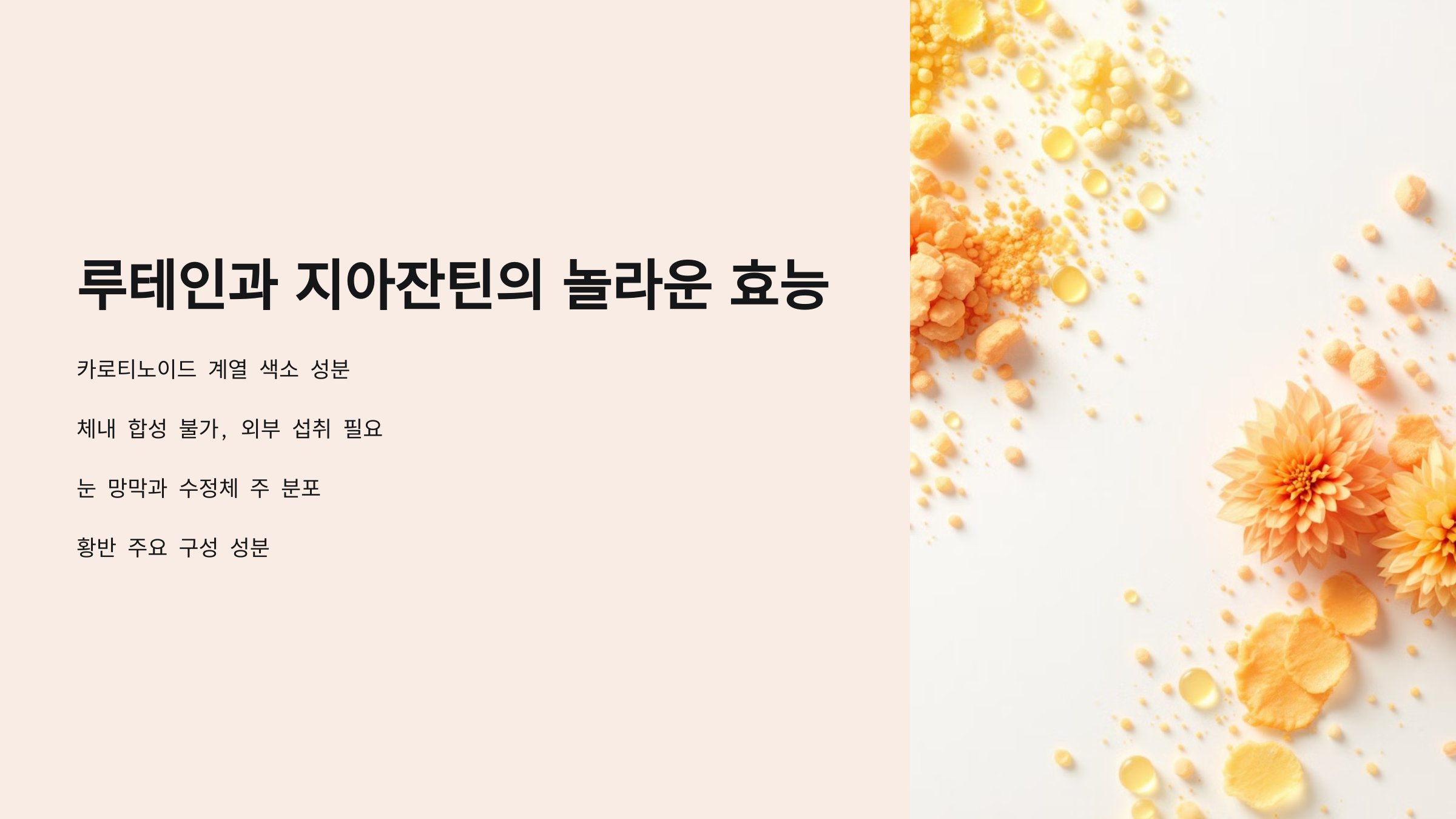 루테인(Lutein)과 지아잔틴(Zeaxanthin)은 눈 건강에 중요한 카로티노이드 성분으로, 황반 변성을 예방하고 시력을 보호하는 역할을 해요.