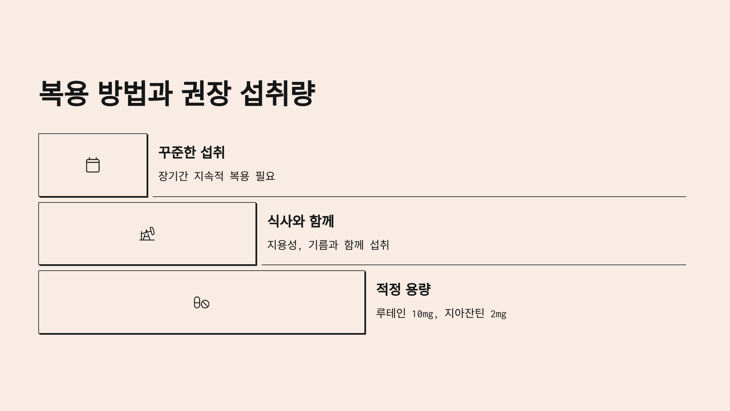 섭취 시간: 식후에 섭취하는 것이 가장 좋아요. 루테인과 지아잔틴은 지용성이므로 지방과 함께 먹으면 흡수율이 높아져요.