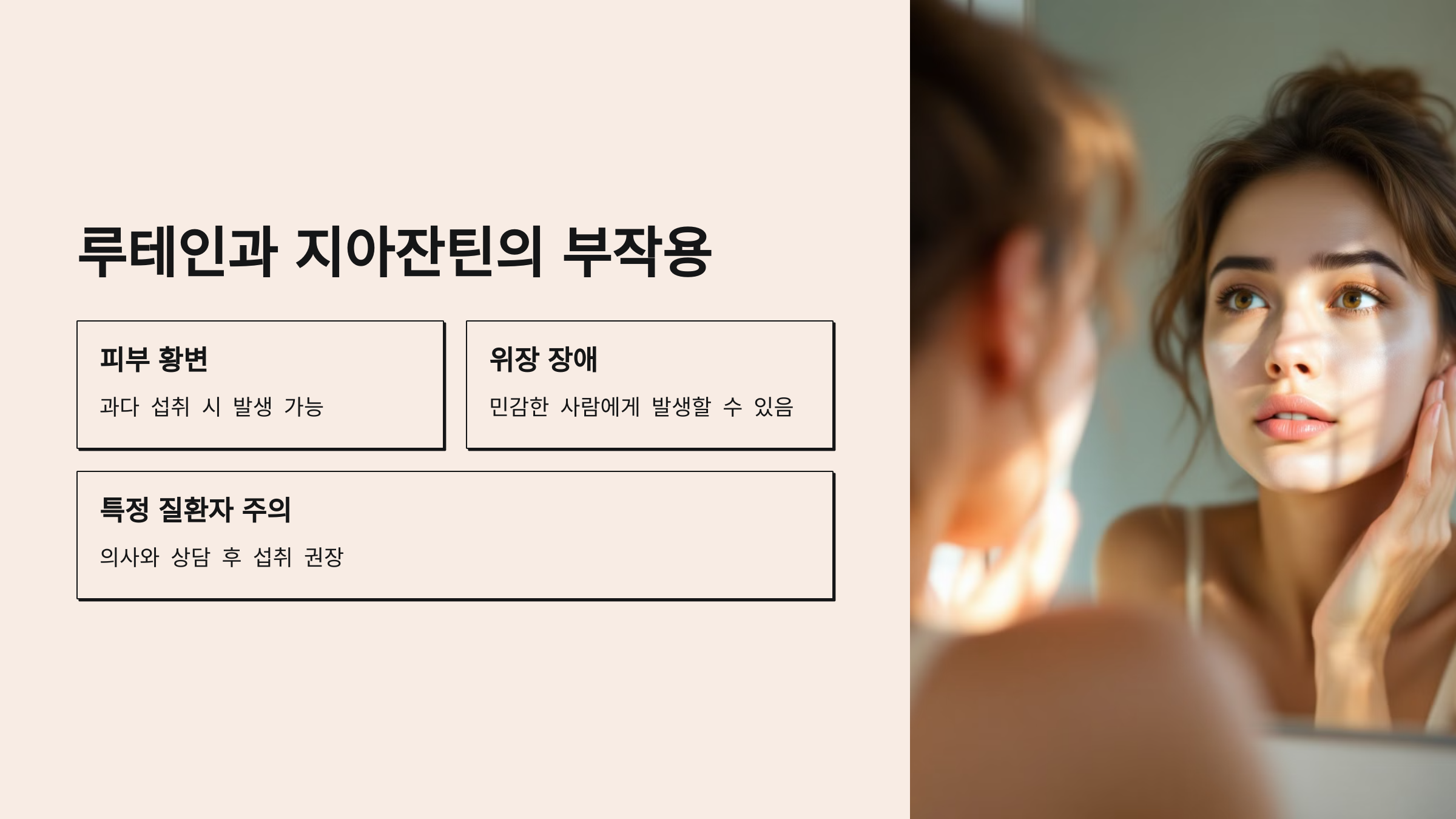 루테인과 지아잔틴은 천연 카로티노이드 성분으로 대부분 안전하지만, 과다 섭취 시 몇 가지 부작용이 나타날 수 있어요.