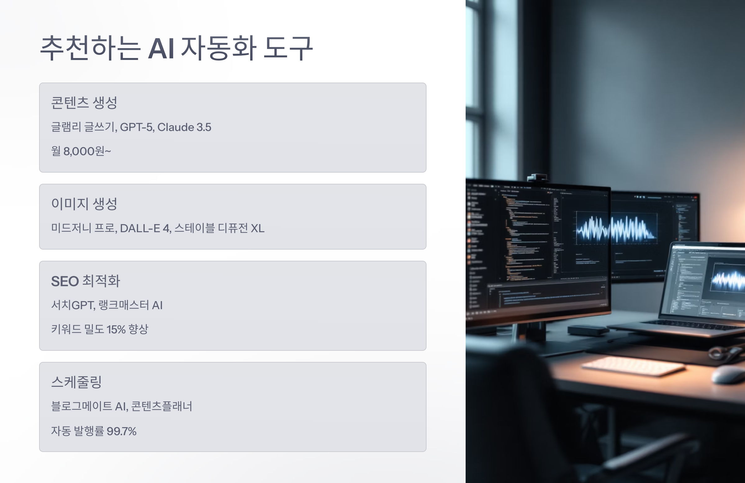 실제로 블로그 루틴을 짤 때 사용하기 좋은 AI 자동화 도구들을 추천할게요. 각각의 특징을 잘 파악하고 선택하면 돼요!