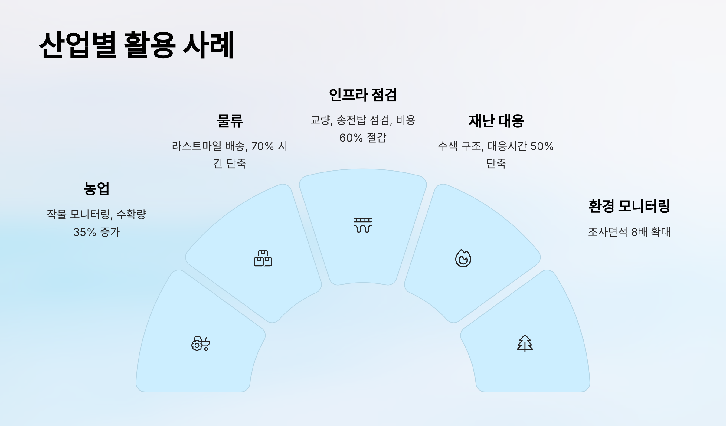 - 🌾 농업: 자율비행으로 농약 살포, 작황 분석, 토양 스캔