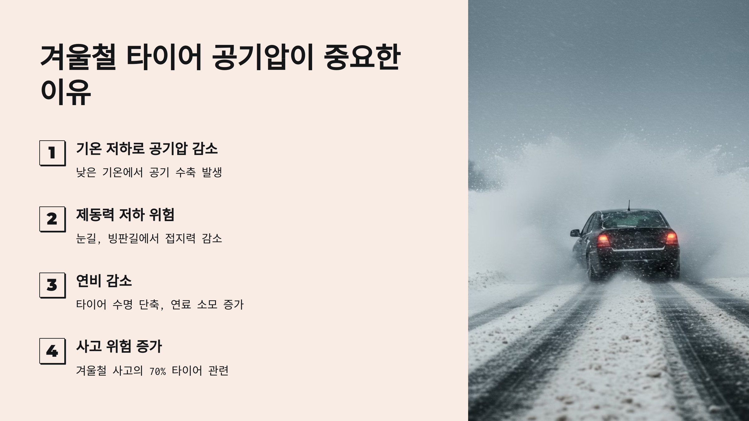 따라서 적절한 타이어 공기압을 유지하는 것이 겨울철 안전 운전의 핵심이에요.