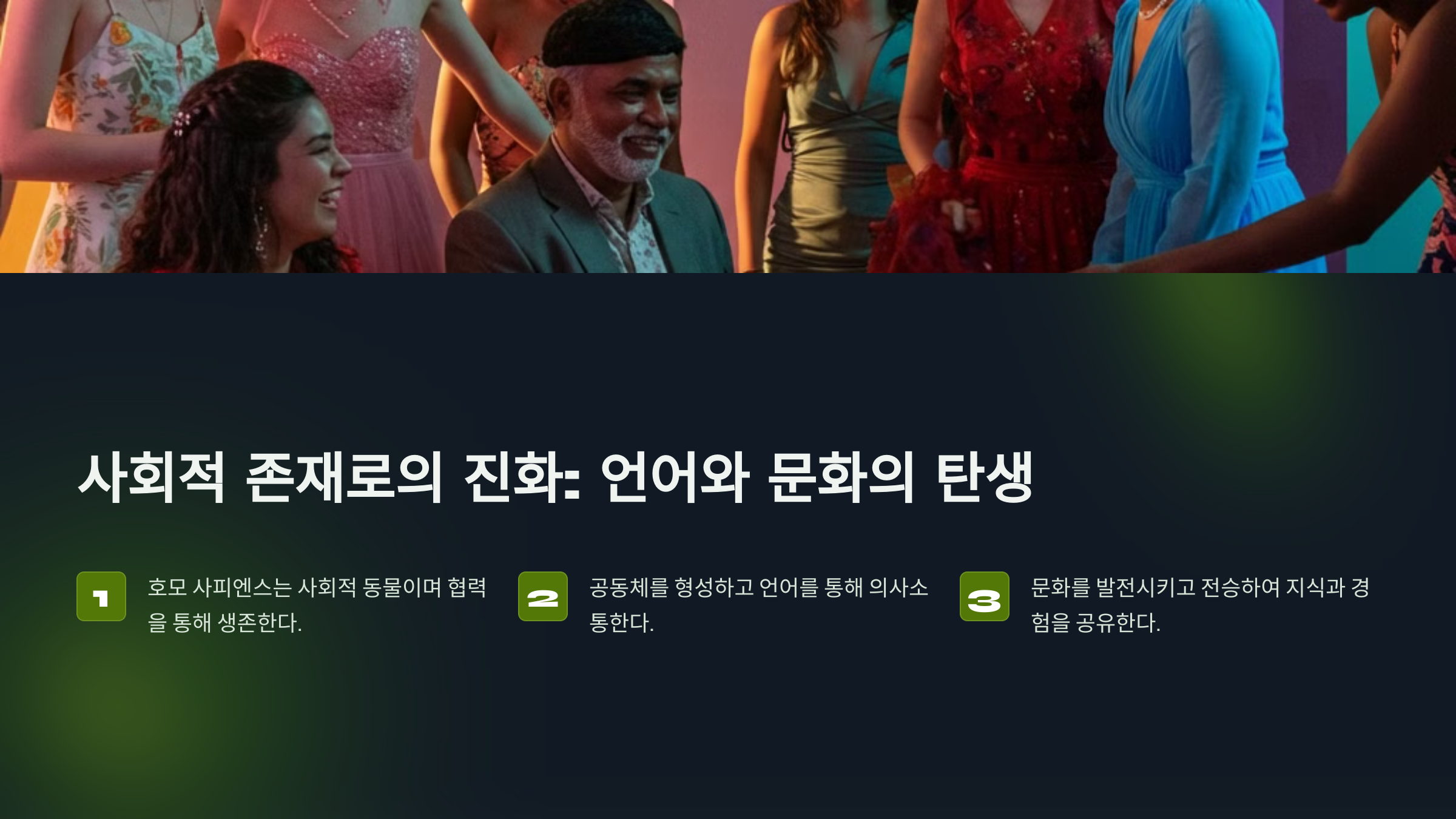 호모 사피엔스의 지능적 우위는 생존에 큰 영향을 미쳤어요. 하지만 혼자서는 살아남을 수 없죠! 다음으로, 사회적 협력이 우리의 생존에 어떤 영향을 주었는지 살펴볼까요? 👥