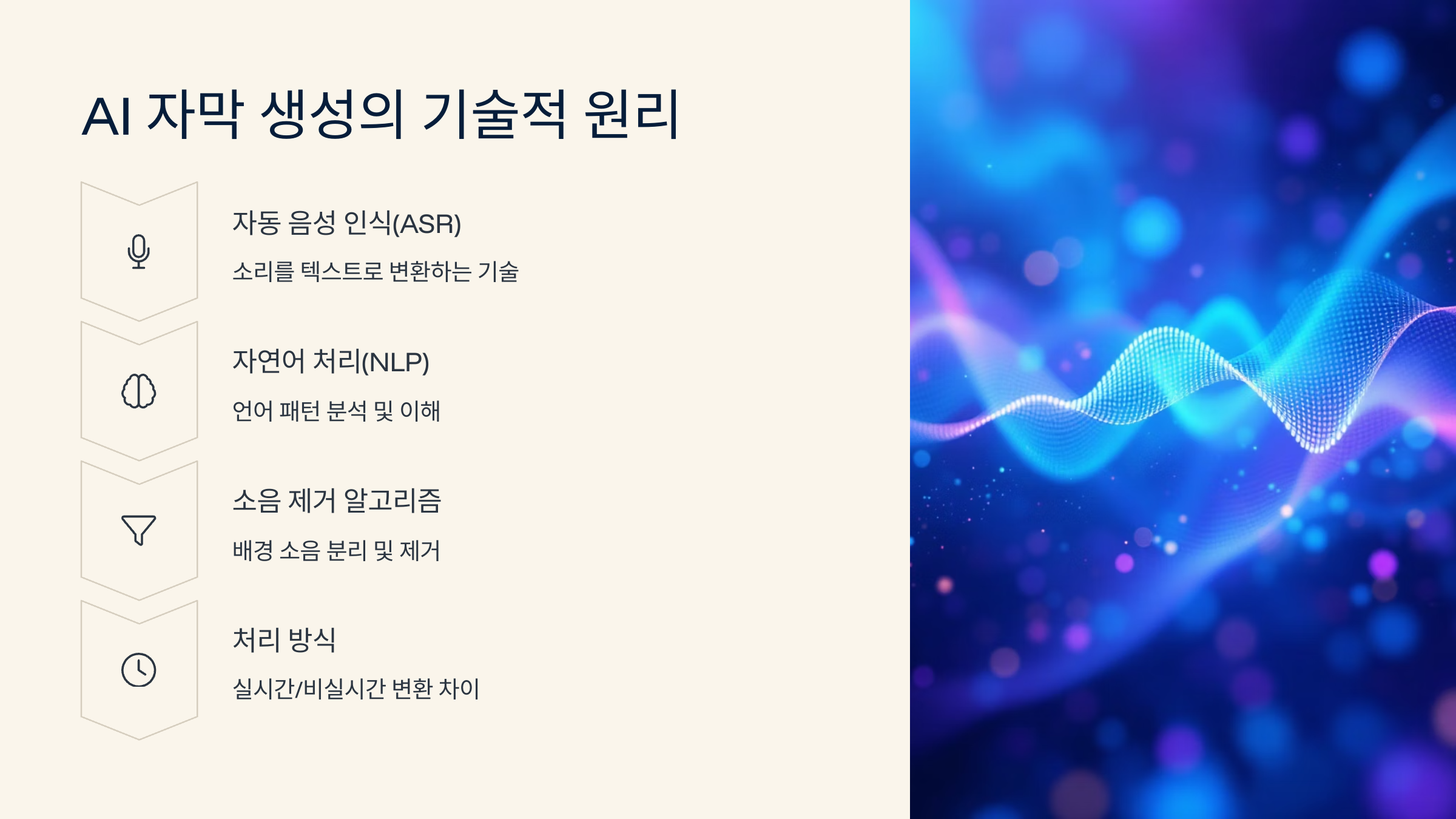 AI 자막 생성은 자동 음성 인식(ASR: Automatic Speech Recognition) 기술을 기반으로 작동해요. 사람의 음성을 실시간 또는 녹음된 음원에서 텍스트로 바꾸는 과정이죠.