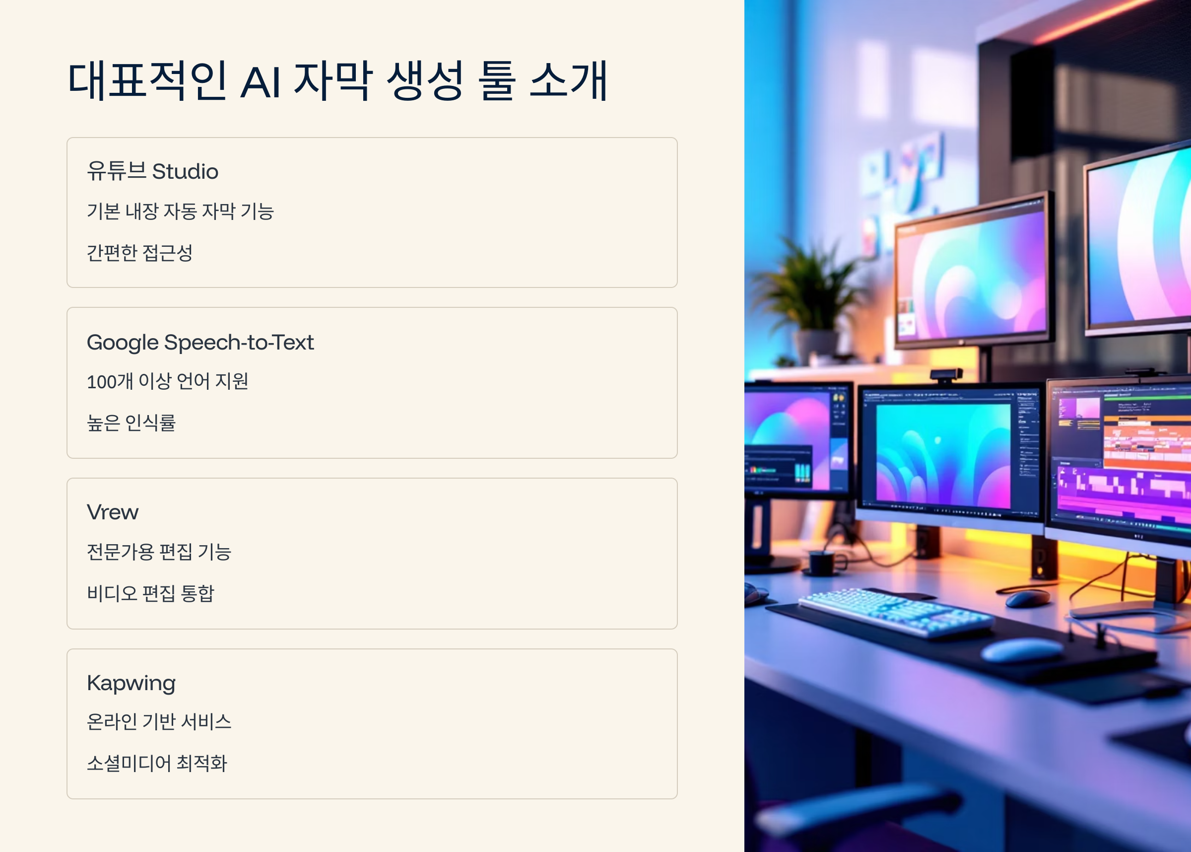 영상 크리에이터들이 자주 사용하는 AI 자막 툴은 크게 두 종류예요. - 자동 자막 삽입 중심 툴 - 편집까지 가능한 자막 편집 툴