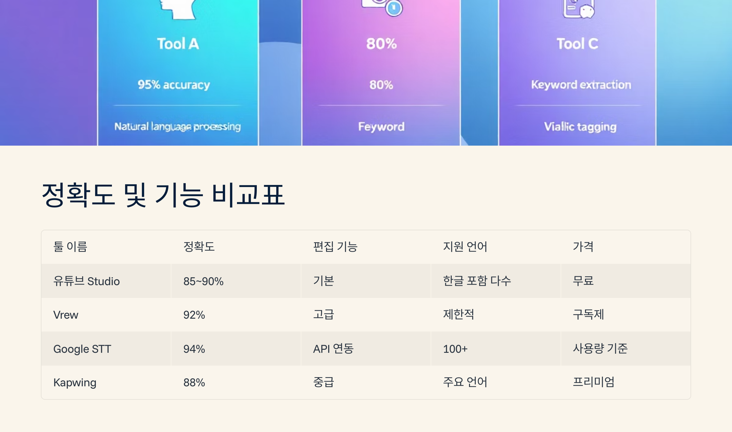 | 툴 이름 | 한국어 정확도 | 편집 기능 | 자막 위치 조정 | 유료 여부 |