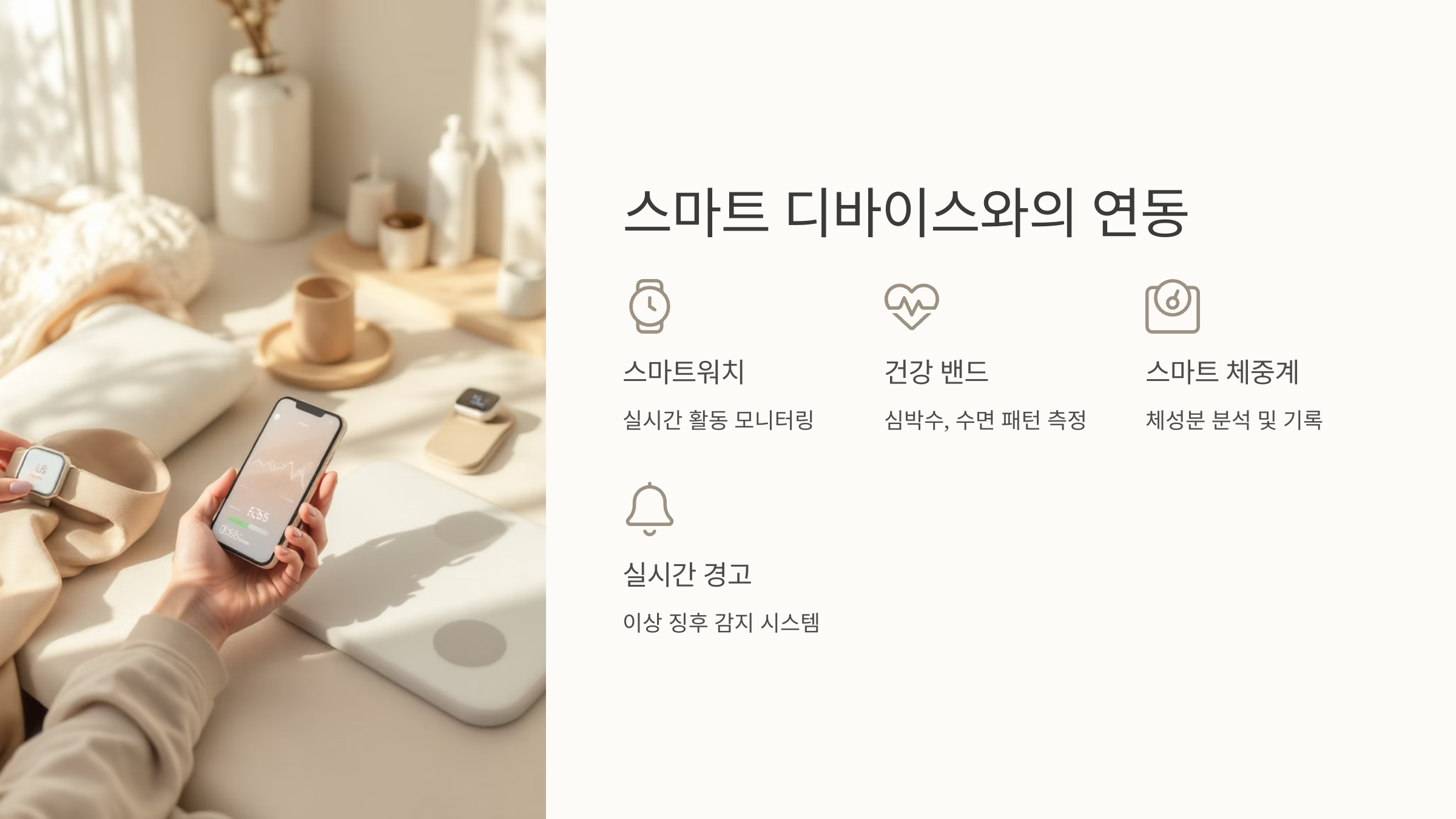 AI 건강 루틴의 또 하나의 핵심은 바로 스마트 디바이스와의 연동이에요. 단순한 분석으로 끝나는 것이 아니라, 실제 생활에서 AI가 행동을 유도할 수 있도록 여러 기기들과 연결돼요.