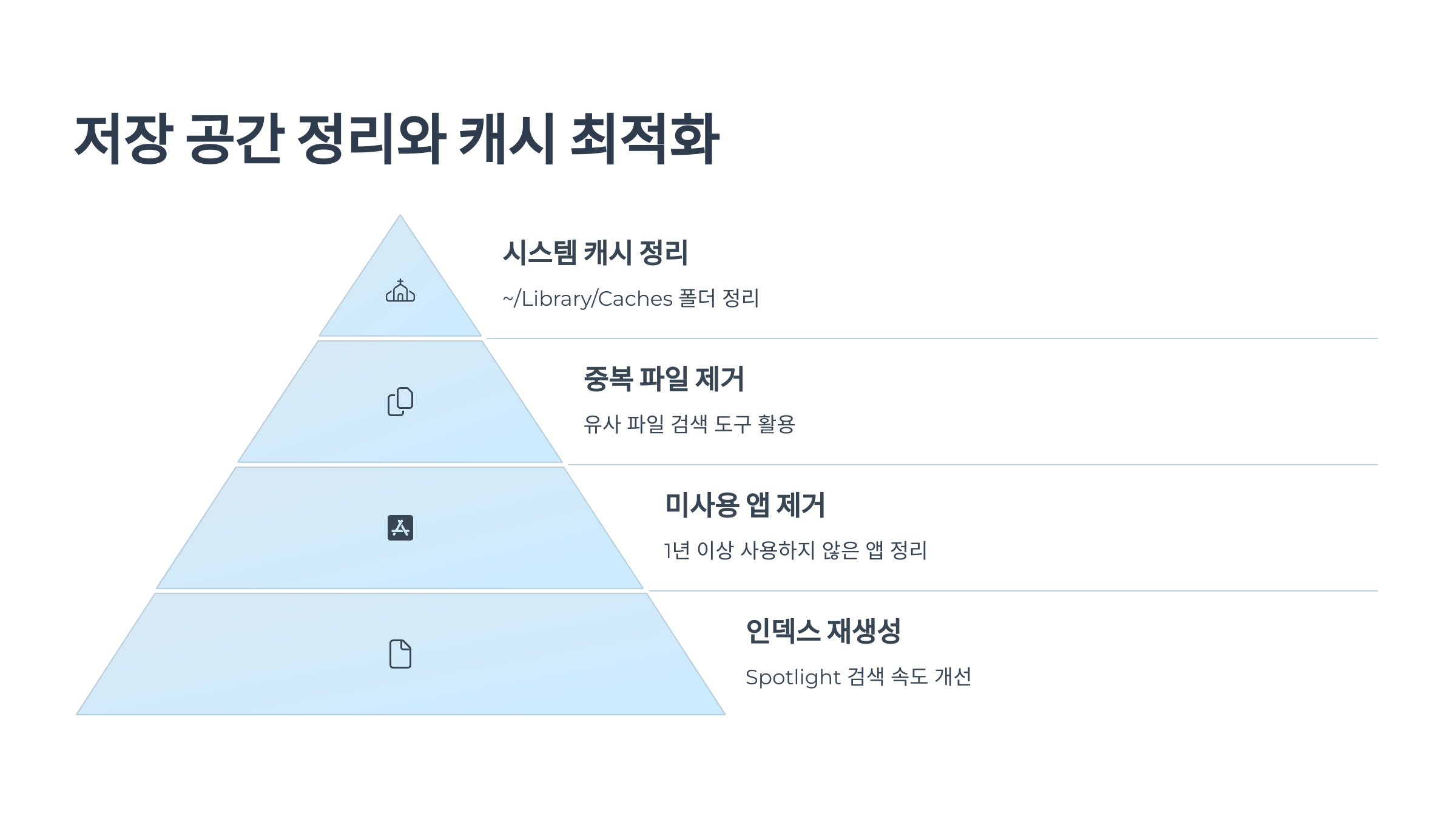 | 캐시 정리 | ~/Library/Caches 폴더 확인 |