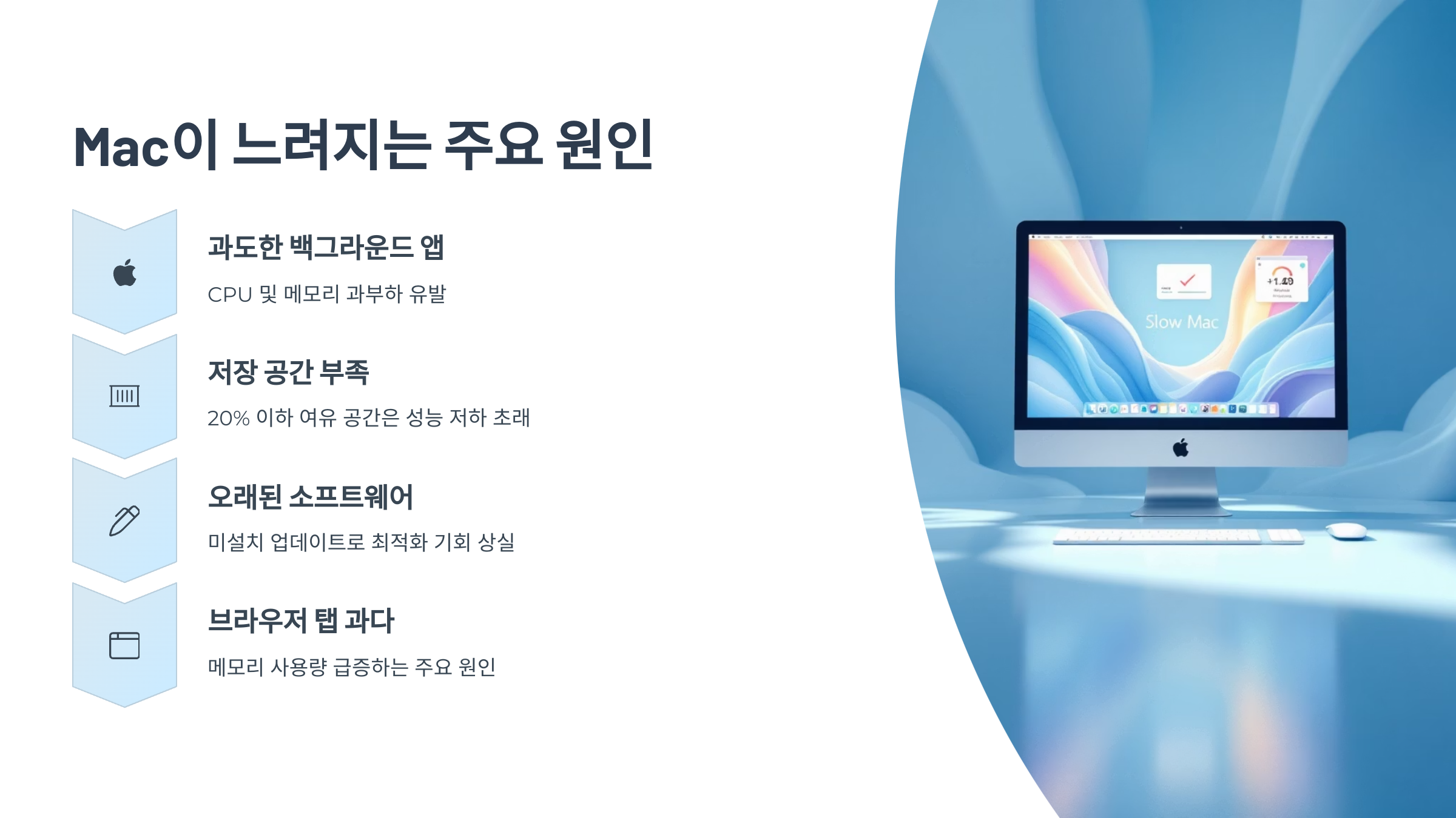 2025년 기준의 Mac은 대부분 M1, M2 칩셋 기반의 실리콘 구조로 이동하며 성능 자체는 강력해졌지만, 여전히 느려지는 증상이나 발열 문제로 불편을 겪는 사용자도 많습니다. 이유는 다양하지만 공통적으로 ‘불필요한 백그라운드 자원 낭비’가 주요 원인입니다.
